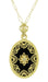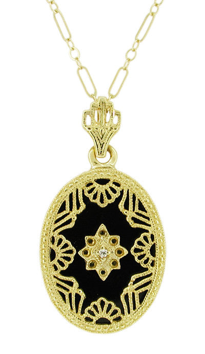 Art Deco Filigree Onyx and Diamond Set Pendant Necklace in 14 Karat Yellow Gold