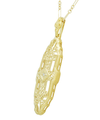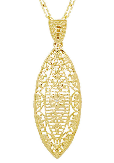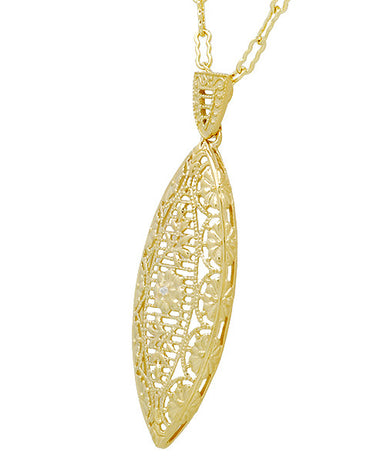 This vintage style leaf shape yellow gold vermeil Art Deco 1920's filigree diamond pendant necklace features a beautiful leaf decorated with floral...