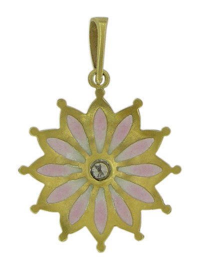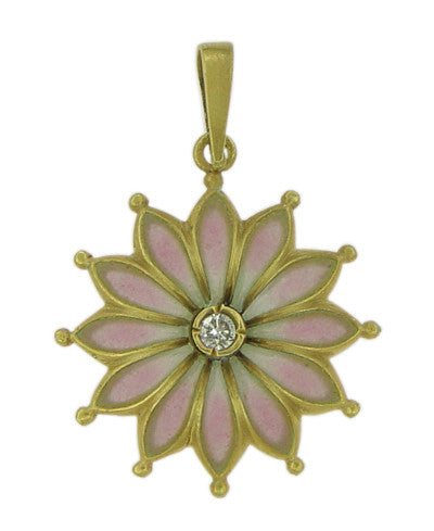 This unique Art Nouveau flower pendant is crafted in the plique à jour technique of enameling. Inspired by nature, the petals of this flower pendant feature pink and green transparent enamel and are outlined in 14K gold, giving the effect of delicate stained glass. A shimmering round brilliant cut diamond of 0.04 carat is securely four prong set at the center of the flower. This romantic pendant measures 1 1/8 inches high (including the bail) by 3/4 inch wide.