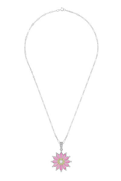 This vintage-inspired circa 1910 sterling silver Art Nouveau plique a jour flower pendant necklace is artisan crafted with pink and green translucent enamel flower petals, outlined with sterling silver to create a stained glass effect.