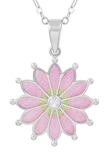 Art Nouveau Plique a Jour Enamel Flower Pendant Necklace in Sterling Silver with White Sapphire | Original Vintage Circa 1910 Design