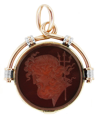 A striking work of art masterfully rendered, this wonderful vintage pendant depicts a hand carved intaglio engraving in sard chalcedony of Poseidon, the fearsome ancient Greek god of the sea and of water. Poseidon's long, curly hair and flowing beard blow in the wind as he intently stares into the distance. The intaglio is framed by 14K rose and white gold with rope detail and features a generous and versatile oval bail that will easily accommodate a thicker neck chain to complement this extraordinary pendant. An heirloom quality pendant, this handsome estate piece measures 1 1/4 inch high by 1 3/16 inch wide and is sure to become a cherished addition to your collection.