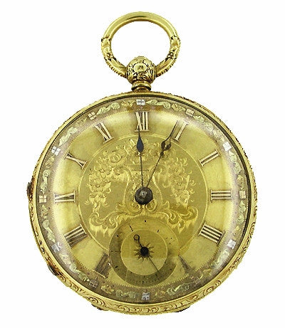 Crafted by hand in 18K yellow gold, this wonderful key wind fusee watch features pink and white gold adornments around the edge of the meticulously engraved dial, with raised roman numerals and a seconds sub dial. This pocket watch has a glass crystal, and an empty space on the back for an initial or monogram that has never been engraved. The movement is signed S.I. Tobias & Co., Liverpool, 6101. This exquisite watch bears English hallmarks dating it to the year 1850. In running condition, this rare pocket watch is a work of horological art for a serious collector. A winding key for this watch is not included.