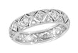 Newington is a one of a kind platinum vintage filigree diamond wedding ring which features a unique hand cut continuous filigree squares tetragon open design. Set with 38 rose cut and old single cut diamonds, this ornate antique eternity wedding band has a low profile and is comfortable to wear. Measures 5.1mm wide.