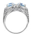 This uncommon vintage filigree blue topaz 2 stone statement ring design measures 3/4 inch wide by 7/16 inch high and sits 1/4 inch off the finger. The bottom of the band measures 2.3 millimeters wide.