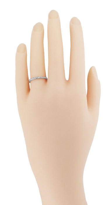 Made to order in your choice of 10K, 14K, or 18K white gold, this lovely and unique heirloom wedding ring measures 2.5 millimeters wide and sits 1.45 millimeters off the finger. This narrow wedding band is perfect for small hands, and can be worn by itself, or paired with dainty vintage engagement ring styles.