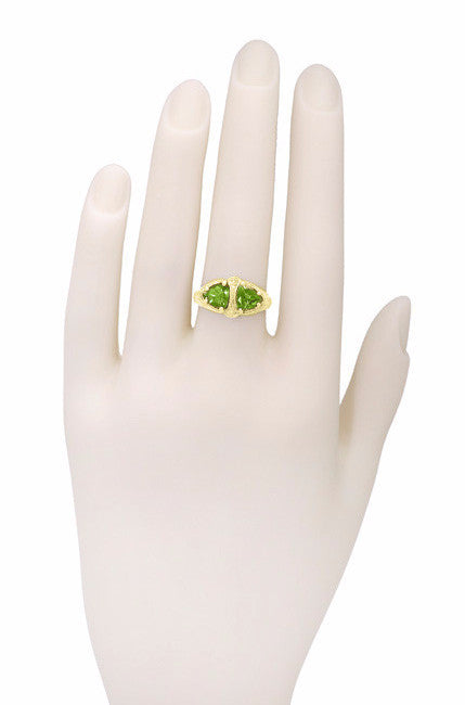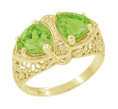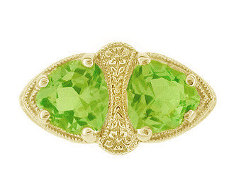 Art Deco Filigree Peridot Loving Duo Ring in 14 Karat Yellow Gold