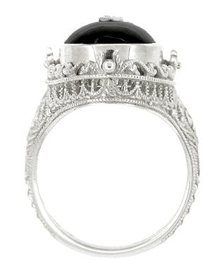 The entire heirloom filigree ring is ornately artisan hand finished and overscored with dewy millgrain edging. The setting top of this very special work of art measures a regal 1 inch high by 5/8 inch wide, rises 3/8 inch off the finger.