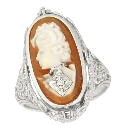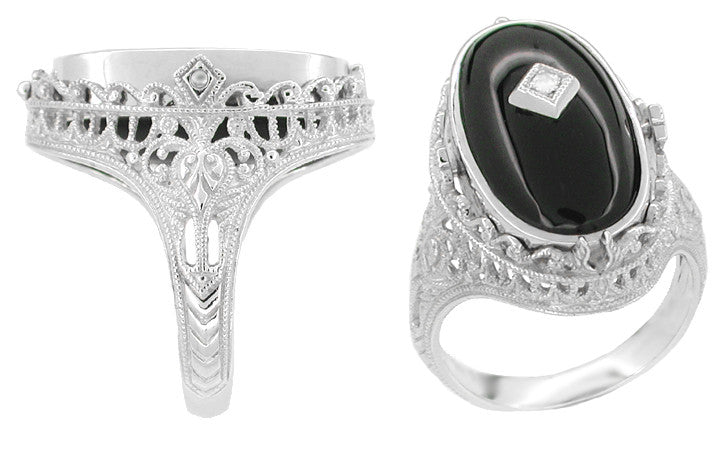 Edwardian Filigree Flip Ring with Carnelian Shell Cameo, Black Onyx and Diamonds in 14 Karat White Gold