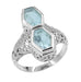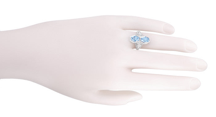 Art Deco Love Duet Two Stone Blue Topaz Filigree Ring in 14 Karat White Gold