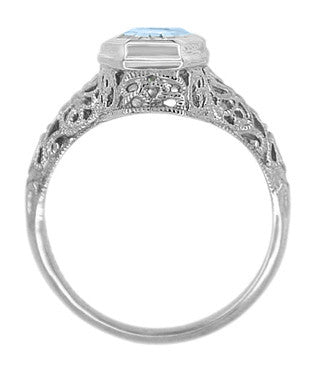 Certain to always be noticed, this unique Art Deco antique filigree 2 stone blue topaz statement ring design measures 3/4 inch long by 1/4 inch wide and sits 3/16 inch off the finger, and is a perfect vintage style "right hand" ring.