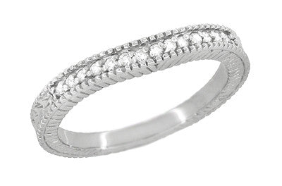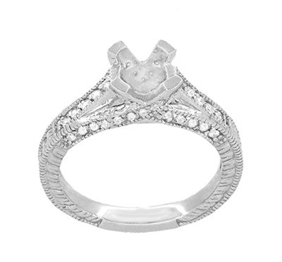 Designed with a wealth of heirloom detailing and crafted in your choice of 14K or 18K white gold, this classic vintage inspired engagement ring semimount for a 3/4 carat round diamond is graced with a sculptural engraved wheat pattern on the 3 outward facing sides of the band with shimmery millgrain on the edges. This ornate and substantial Art Deco style ring mount is set with 40 round brilliant cut diamonds of F/G color and VS clarity for a total of 0.40 carat for the ring. Choose natural diamonds or lab created diamonds according to your preference.