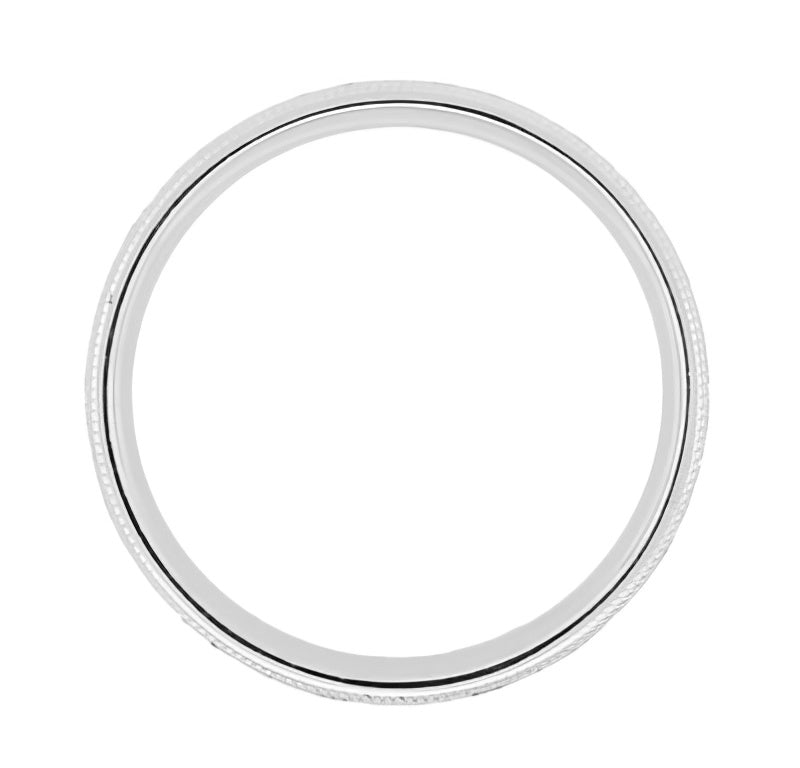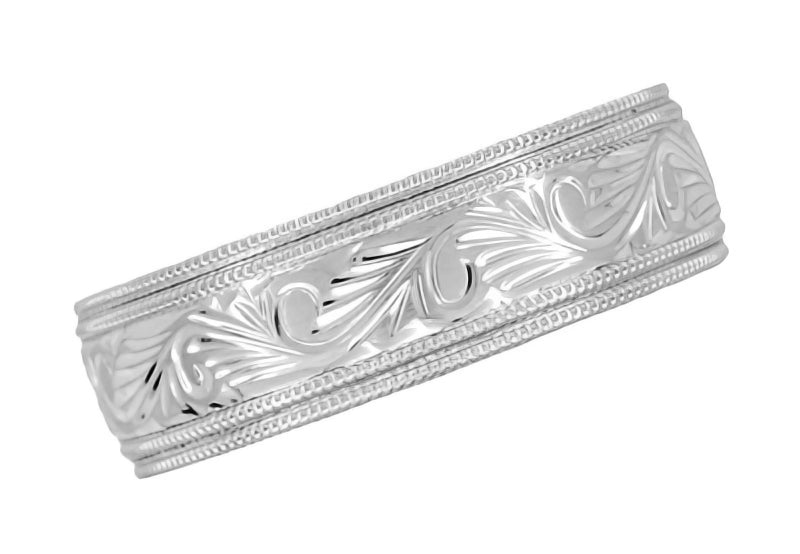 Men's Art Deco Hand Engraved Vintage Scrolls Double Millgrain Edge 7mm Wide Wedding Band in White Gold