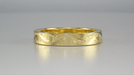 This classic yellow gold hand carved wedding band has a substantial feel and measures a comfortable 5 millimeters wide and 2.3 millimeters thick.
