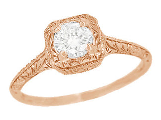 This dainty Art Deco antique style engraved wedding ring is meticulously hand crafted in 14K rose ( pink ) gold, and features a romantic engraved wheat pattern on the two outward facing sides of the band, framed by light scattering millgrain edging for a wonderful finishing touch. Measuring a narrow 1.5 millimeters wide, and rising 1.8 millimeters off the finger, this exquisitely detailed rose gold curved wedding band is sure to be cherished as a symbol of your love.
