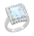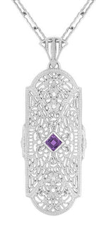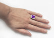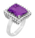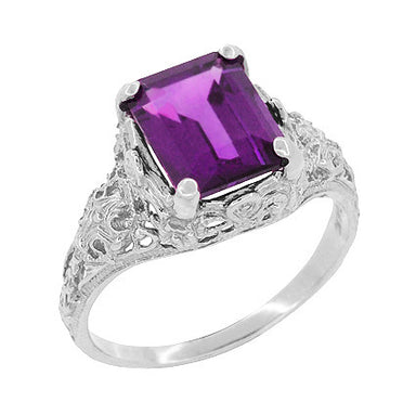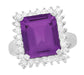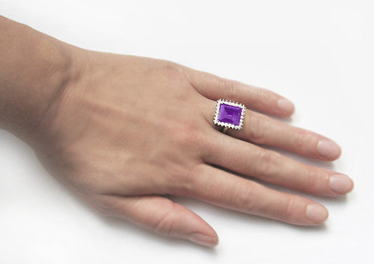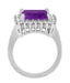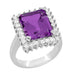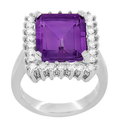 This gorgeous Retro amethyst statement ring in luxurious 18K white gold features a stunning 6.25 carat emerald cut natural deep purple amethyst, birthstone for February. The large center amethyst gemstone is framed with 26 shimmering natural round brilliant full cut diamonds of white and bright F/G color and VS clarity, for a total diamond weight for the ring of 0.75 carat.
