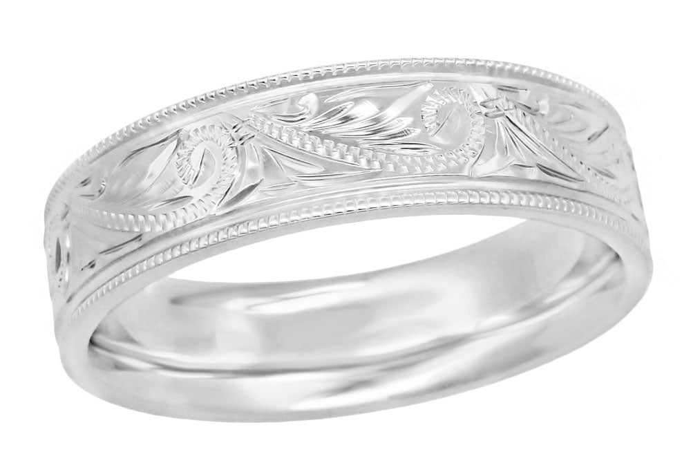 Men's 6mm Wide Vintage Hand Engraved Scrolls Western Wedding Band in White Gold - 10K, 14K, or 18K