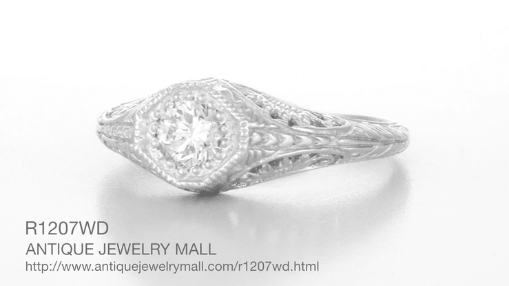 Artisan finished in a lovely pierced sunflowers filigree design, this affordable vintage diamond engagement ring design is intricately engraved with a carved wheat pattern down the sides of the band.