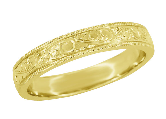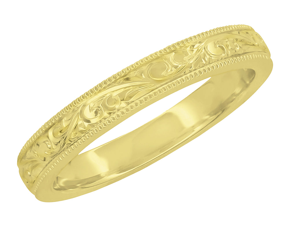 Victorian Yellow Gold Acanthus Scrolls Carved Antique Style Wedding Band - 3mm Wide