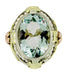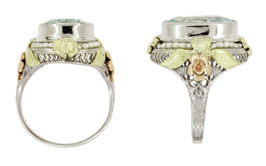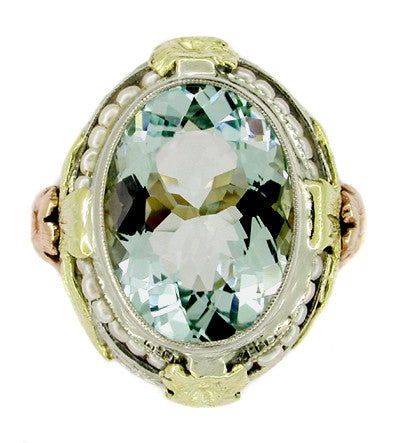 Art Deco Filigree Aquamarine Estate Ring Framed with Seed Pearls in 14 Karat Tricolor Gold