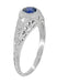 This unique sapphire birthstone ring features a low profile design which makes it an excellent choice for anyone seeking an heirloom quality blue sapphire engagement ring with plenty of antique detail, which will not "catch" on things and get in the way of a busy daily routine.