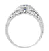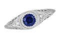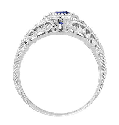 Art Deco Engraved Blue Sapphire and Side Diamond Filigree Engagement Ring in White Gold
