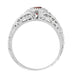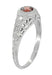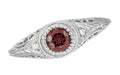 Finely crafted in your choice of 18K or 14K white gold, this 1920's classic rhodolite ring design showcases delicate pierced open filigree and hand finished intricate artistic carving.