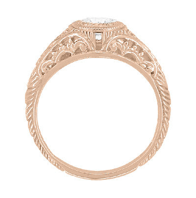 Hand crafted and engraved with fine floral details, this replica vintage 1920's 14K rose gold white sapphire ring features a low profile design which makes it an excellent choice for anyone who would love an heirloom quality white sapphire engagement ring with plenty of antique detail, which will not "catch" on things and get in the way of a busy daily routine.