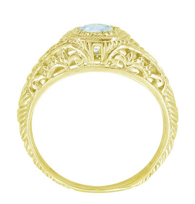 Finely artisan crafted in your choice of 14K or 18K yellow gold, this beautiful antique reissue aquamarine ring features a delicate pierced filigree scrolls 1920's design, hand finished and engraved around the top of the ring with intricate details with wheat engraving down the sides. It measures 6.9 millimeters wide at the top of the ring, tapering down to 1.7 millimeters wide at the bottom of the band and rises 5.3 millimeters off the finger.