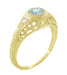This lovely Art Deco filigree yellow gold aquamarine engagement ring features a securely bead bezel set sky blue natural aquamarine ( March Birthstone ) of 0.35 carat, flanked by 2 shimmering F/G color and VS clarity round brilliant diamonds totaling 0.04 carat.