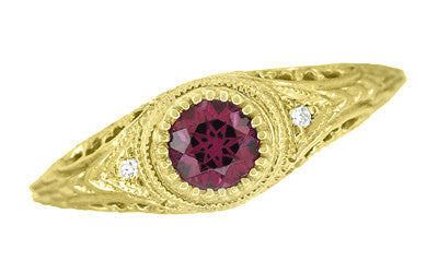 This beautiful yellow gold Art Deco filigree garnet engagement ring features a natural rhodolite garnet ( January Birthstone ) of 0.50 carat, in a unique low profile bead bezel setting accented with two diamonds on the sides.