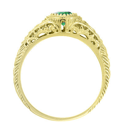 This beautiful Art Deco filigree vintage reissue tsavorite garnet engagement ring in 18K yellow gold showcases a stunning vibrant natural green tsavorite garnet ( January Birthstone ) of 0.33 carat in a secure bead bezel setting, accented with 2 shimmering F/G color and VS clarity round brilliant side diamonds totaling 0.04 carat.