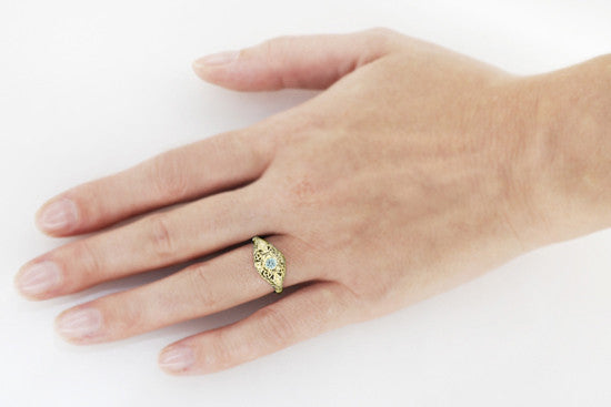 Edwardian Aquamarine and Diamonds Scroll Dome Filigree Engagement Ring in 14 Karat Yellow Gold
