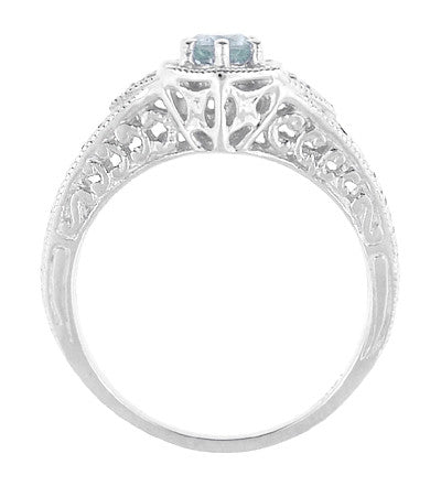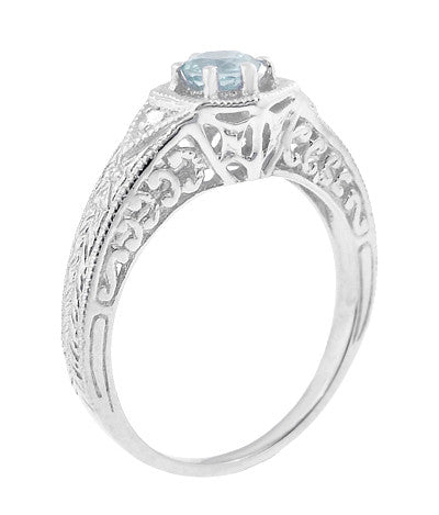 Art Deco Aquamarine Filigree Engraved Engagement Ring in 14 Karat White Gold with Side Diamonds