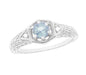 Meticulously crafted in white gold, this beautiful engraved aquamarine ring features an intricately detailed carved wheat pattern accented with millgrain edging on the outside top of the band and sides adorned with lovely pierced filigree scrollwork. The timeless vintage style of this classic aquamarine engagement ring is sure to be cherished.