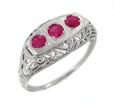 Three Stone Ruby and Diamonds Filigree Ring in 14 Karat White Gold