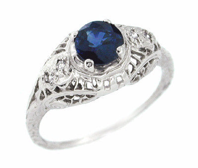 This simply beautiful Art Deco filigree sapphire engagement ring in white gold features a securely 4 prong bead set round brilliant natural blue s...