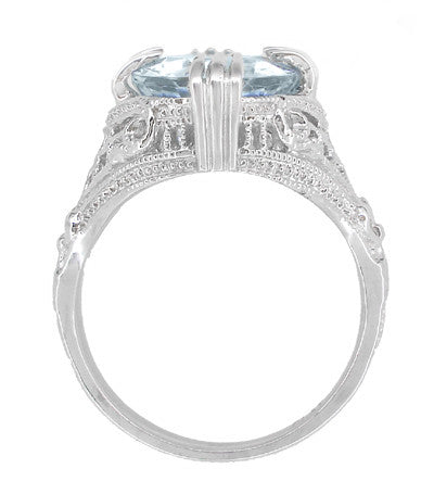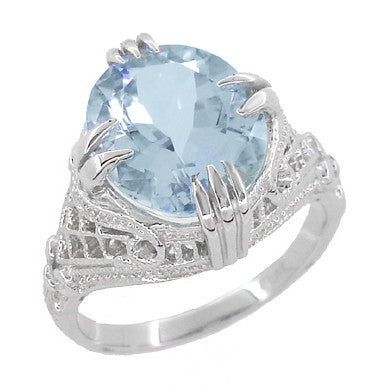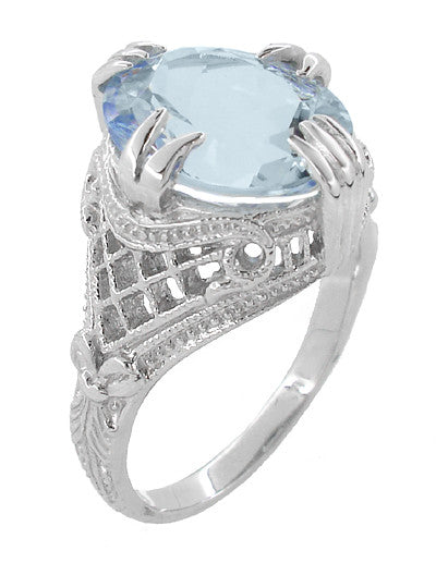 Large Oval Aquamarine Art Deco Filigree Ring in Platinum - March Birthstone