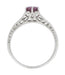 Refreshingly distinctive, this antique style platinum rhodolite garnet engagement ring is sure to be embraced as a symbol of your love!