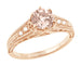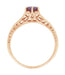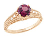 Artisan crafted in an elegant antique Art Deco 1920's design, this hand finished rhodolite ring replica features engraving on the top of the band with flowing pierced filigree scrolls openwork illuminating the underside of the rhodolite garnet ( January Birthstone ) for maximum brilliance.