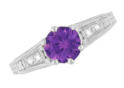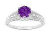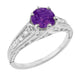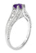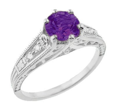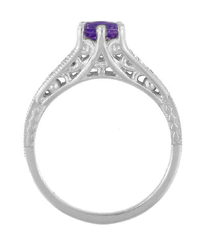 This lovely 1920's design amethyst engagement ring features intricately detailed engraving on the top of the band with its sides adorned with delicate pierced filigree scrollwork.