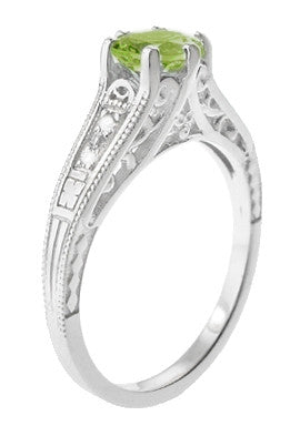Filigree Peridot and Diamond Art Deco Engagement Ring in 14 Karat White Gold