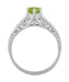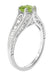 Crafted in lavish platinum, this lovely 1920's peridot engagement ring design features intricately detailed vintage engraving on the top of the band and sides adorned with delicate pierced filigree scrollwork.