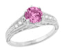 Meticulously hand crafted in lavish platinum, this lovely antique style pink sapphire engagement ring features detailed engraving on the top of the band with the outward facing sides of the ring decorated with classic pierced filigree scrollwork.