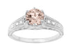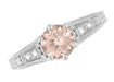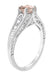 This 1920's era vintage Art Deco filigree morganite engagement ring design features a beautiful natural pale peach-pink color morganite gemstone of 1.20 carat, in a secure 6 prong setting, framed with 4 shimmering F/G color and VS clarity round brilliant diamonds totaling 0.12 carat.