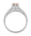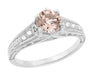 Artisan crafted to order in 14K white gold, this lovely vintage reissue morganite filigree engagement ring showcases finely detailed Art Deco geometric engraving on the top of the band with the sides of the ring featuring unique delicate pierced filigree scrollwork. This classic antique style morganite engagement ring is sure to be adored!