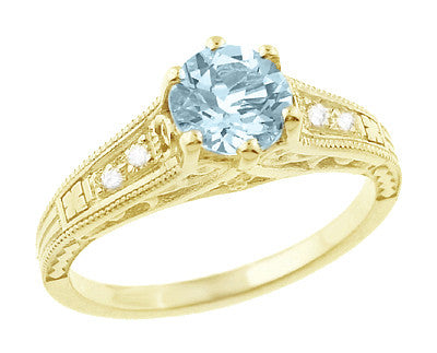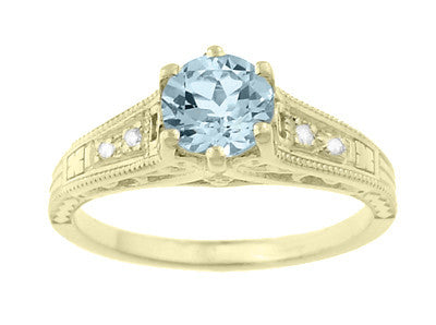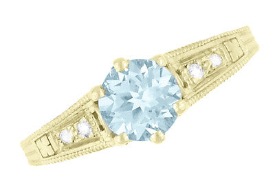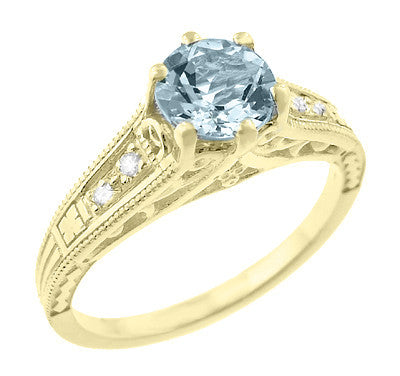 This gorgeous antique style Art Deco filigree yellow gold aquamarine engagement ring features a securely 6 prong set natural aquamarine of 0.75 carat flanked by 4 shimmering F/G color and VS clarity round brilliant diamonds totaling 0.11 carat.