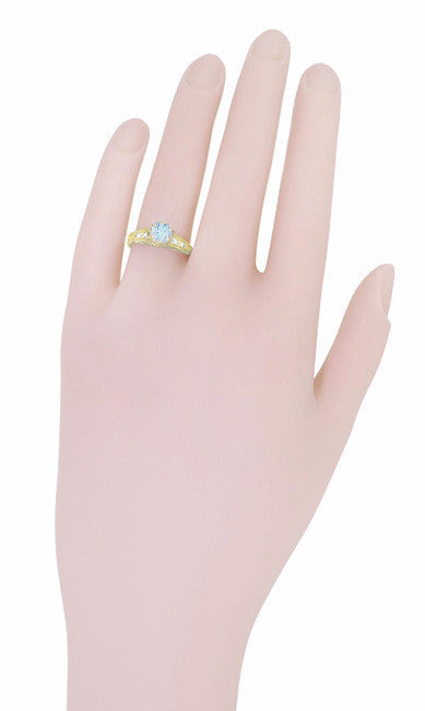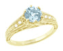 Meticulously crafted in 14K yellow gold, this lovely 1920's design aquamarine engagement band features intricately detailed engraving on the top of the band and outward facing sides adorned with a delicate pierced filigree scrollwork design.