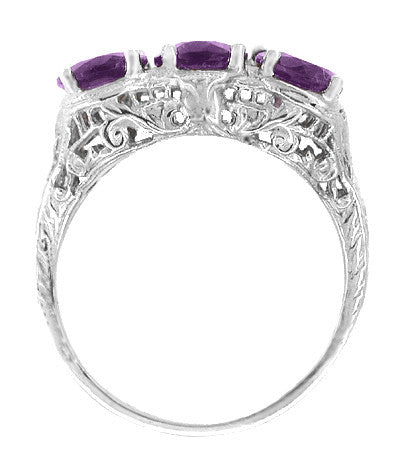 Edwardian Three Stone Oval Amethyst Filigree Ring in 14 Karat White Gold