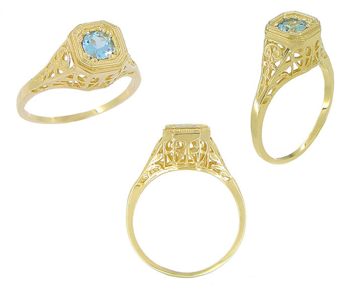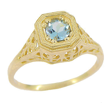 Art Deco Majesty Aquamarine Filigree Ring in 14 Karat Yellow Gold